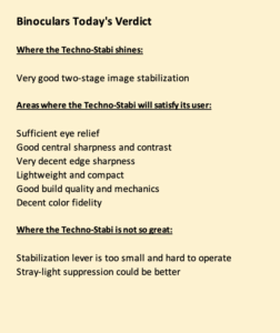 The Alpen 20×42 “Apex Steady” shares most if its specs with other 20×42 stabilized binos. It has been on the market for a year or so, and if you think about it, a lot speaks against such a 20×42: tiny exit pupil; less than optimal ergonomics (the battery is placed where you usually have your thumbs when holding the bino); CA is acceptable on-axis but increases from about 50% of the FOV outwards from the optical axis (which is to be expected in such a small body with high magnification, despite “HD” optics); there are clearly visible spikes on bright point light sources; judging from reflections when observing close to bright light sources, stray-light suppression is not optimal; the focusser and the stabilization lever are small and hard to operate with gloves, etc. On the other hand, the optics of the Alpen, which are not superb, are quite okay, central sharpness is good, edge sharpness very acceptable; the weight is surprisingly low; mechanics including the focuser are fine; the build quality is good. AND: The stabilization works quite well. The standard stabilization mode – Alpen calls it “balance mode (floating mode)” – which is supposed to be suitable for observing moving objects – eliminates the tiny vibrations of my hands quite effectively, but not the larger movements of my arms. The “detail mode (still mode)” also eliminates movements with a larger amplitude. The image gets as stable as in other stabilized binoculars with a much lower magnification, such as the Canon 10×42 or 10×32. In this mode, the Alpen provides an impression that is closer to a mounted binocular than what many other high magnification stabilized binoculars provide. So despite the “flaws” mentioned above – esp. the tiny exit pupil – the detail recognition when observing with the Alpen under normal lighting conditions is surprisingly good. It might possibly show you at least as much as you would see with a mounted 25x spotting scope (esp. keeping in mind the “binocular summation” effect) – at a weight of less than 800 grams.
