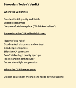 And a very last word: the format 10×30 / 10×32 is not really my thing. I own very few binos of that size, because I prefer larger EPs than 3 mm, but checking the 10×30 version of the new CL briefly in the shop surprised me positively. I found it’s eyebox even more comfortable than in the 8×30. So for those who like the 10×30 format, the new CL might be worth considering.
